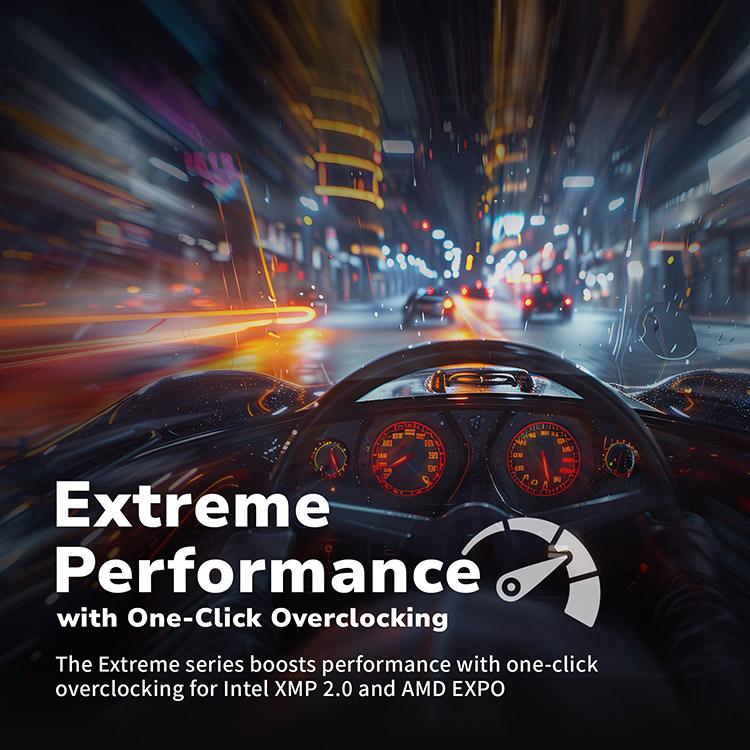 The Extreme series boosts performance with Intel XMP 2.0 and AMD EXPO one-click overclocking.