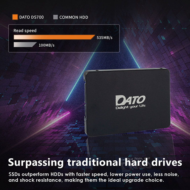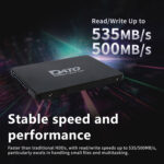 As a leading ssd hard drive manufacturer, Datotek delivers high-performance 2.5-inch SATA III SSDs designed to replace conventional HDDs with remarkable speed and reliability. With read speeds up to 535MB/s and write speeds up to 500MB/s, it dramatically improves small file transfers, multitasking, and system responsiveness. Advanced Smart SLC Caching accelerates write operations and enhances I/O efficiency, while the solid-state design eliminates moving parts, providing superior shock, drop, and vibration resistance for mobile and portable devices. Consuming less power than traditional hard drives, it extends battery life and reduces thermal output under continuous load. Fully compliant with SATA standards, this SSD offers a seamless upgrade path with lower latency, silent operation, and long-term durability.